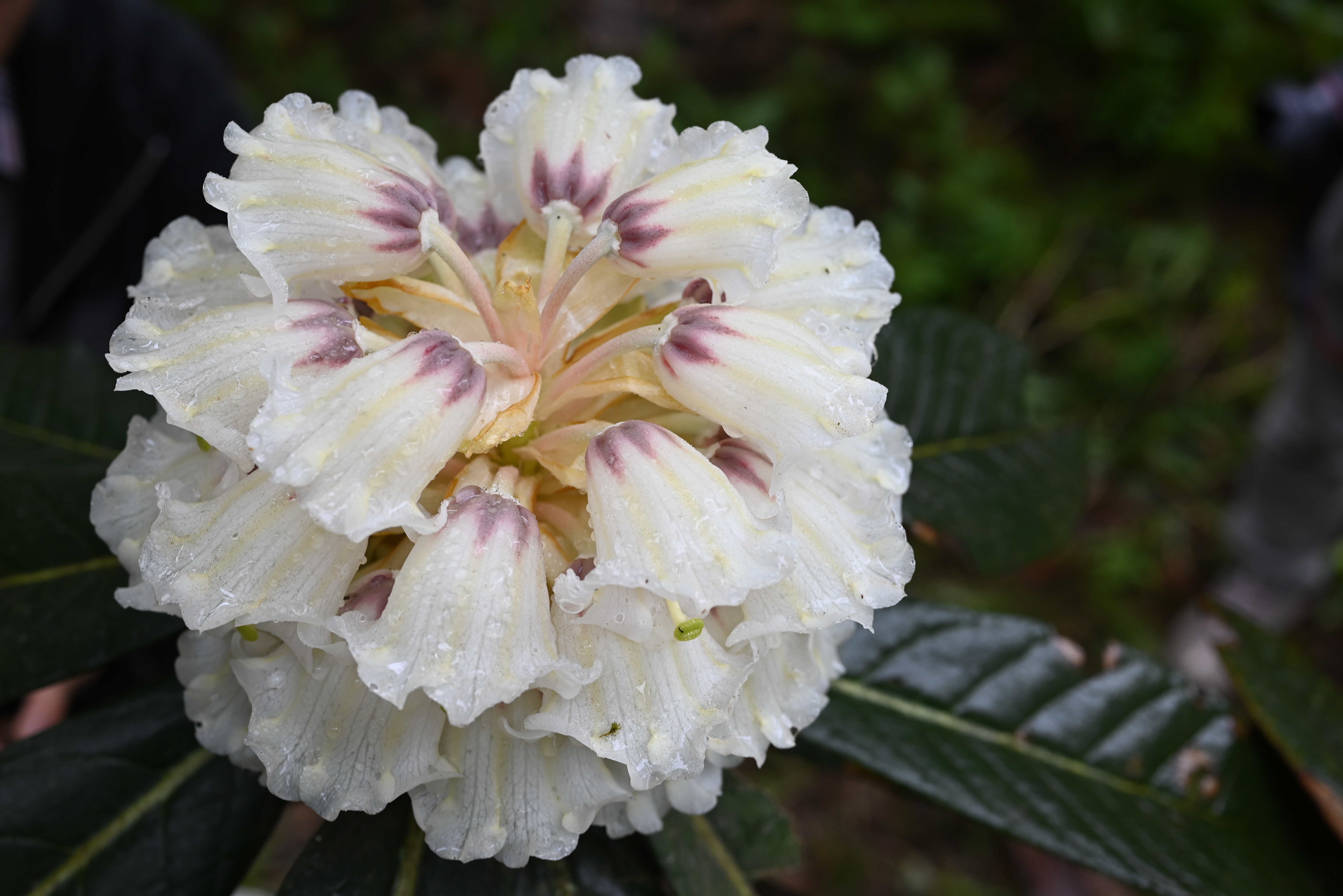 “花序直径至少是20厘米,单花直径在5厘米以上,花大。”王飞介绍,在保育园内,这次共有2株凸尖杜鹃开花,共有4朵,其中一朵花序共有单花28只。在《中国植物志》的记载中,凸尖杜鹃花序常是每朵15至20只单花。